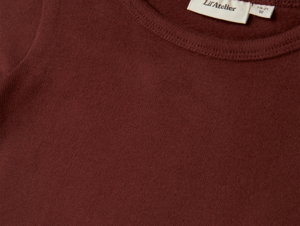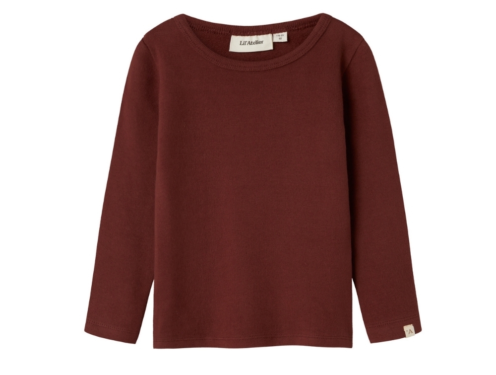 Bluse i rødbrun nuance fra Lil' Atelier med rund halsudskæring og lange ærmer. En enkel og blød basic-style, der kan bruges alene eller som lag under trøjer og kjoler.