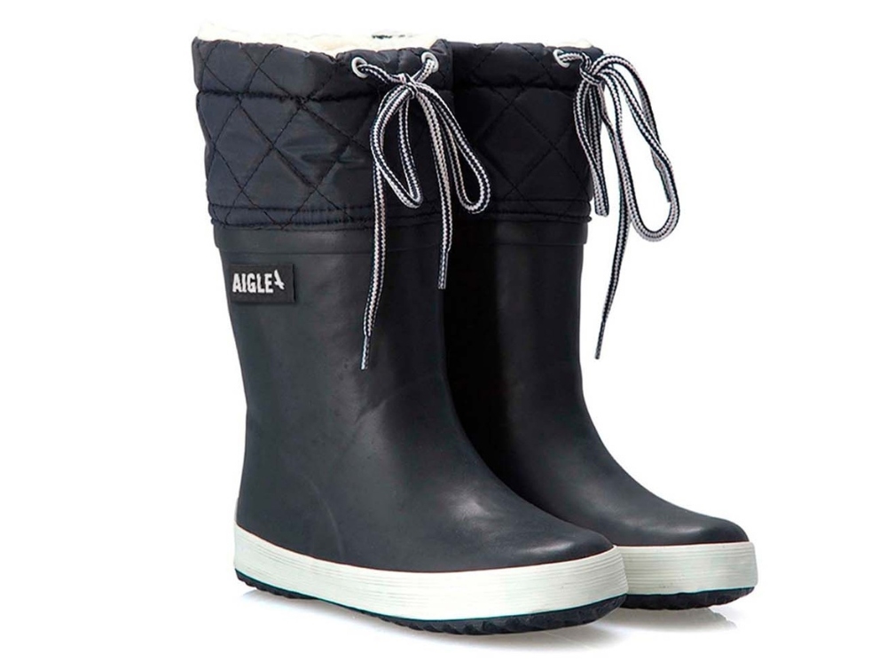 Vintergummistøvle i mørkeblå (marine blanc) fra Aigle med varmt 100% polyester foer. Skaftet har quiltet overdel med snøre. Støvlen er oplagt som supplement til almindelige vinterstøvler.