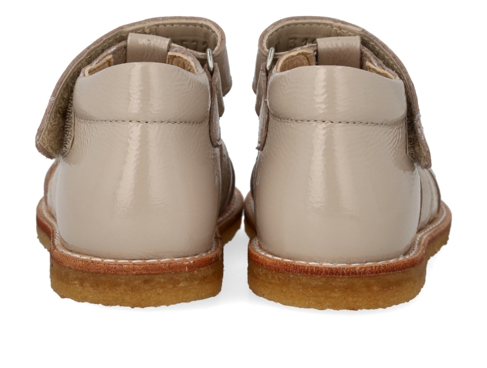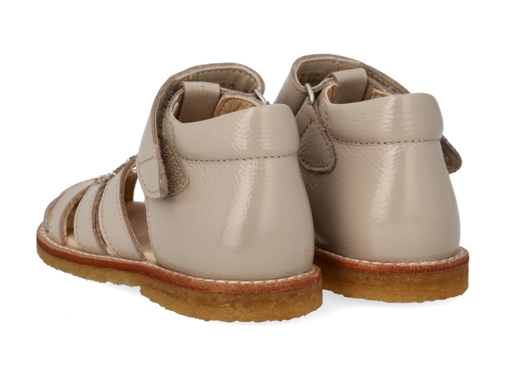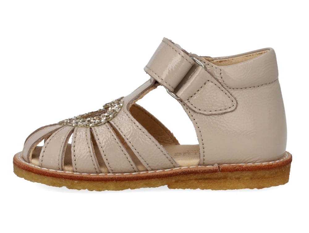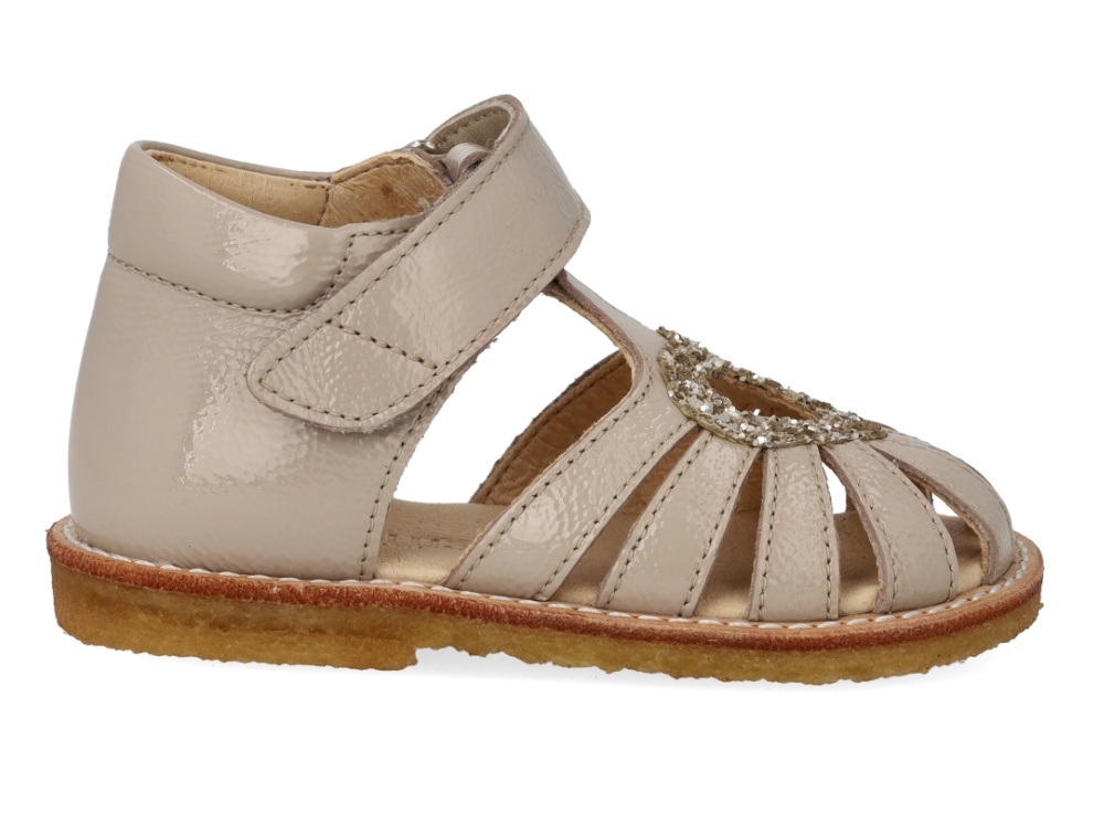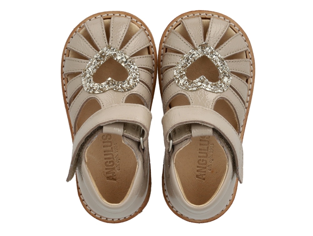 Angulus sandal i sand nuance til børn med funklende glitterhjerte og justerbar velcrorem. Sandalen er fremstillet i læder med kromfrit skindfoer med lak, vatteret indersål, polstret krave og fast hælkappe.