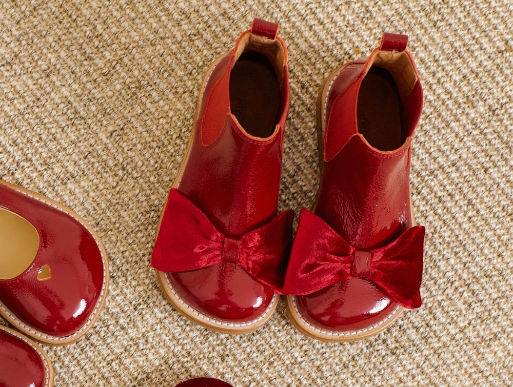 Chelsea støvle i rød lak fra Angulus med stor veloursløjfe på snuden. Støvlen er designet med elastik i siderne og hælstrop, som gør den let at få af og på. Modellen er skabt på en medium til bred læst, hvilket gør den velegnet til børn med normale og lidt bredere fødder.