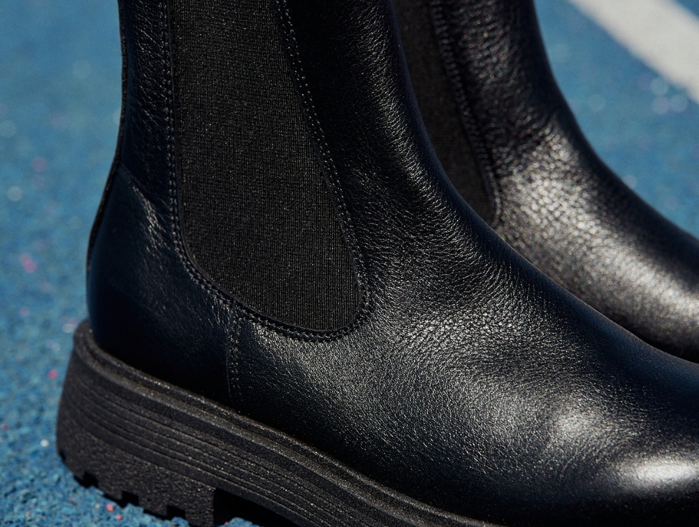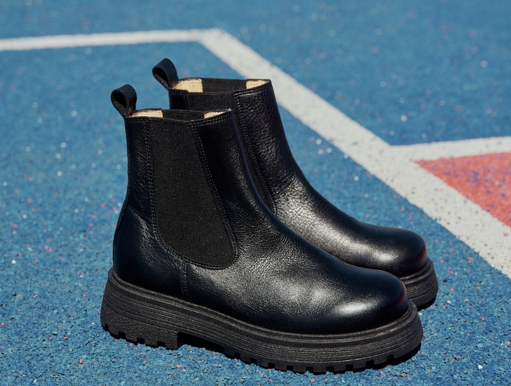 Chelsea støvle i sort skind fra Angulus med chunky tracksål. Modellen har elastik i siderne og en rund snude, der giver et klassisk og tidløst udtryk kombineret med en moderne, kraftig sål.