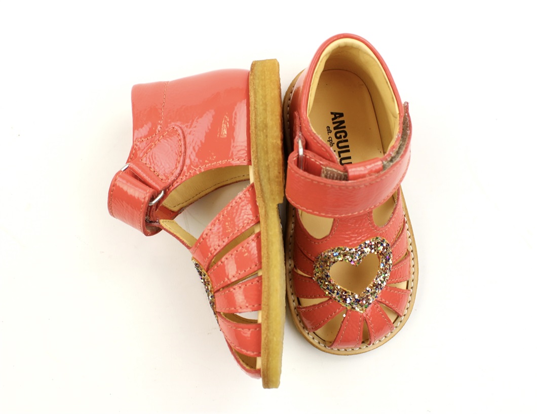 Koralfarvet sandal med lak og multifarvet glimmer og med udskæring af hjerte fra Angulus.