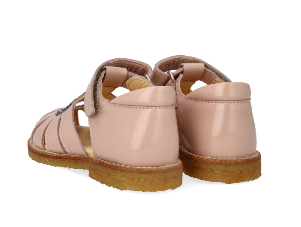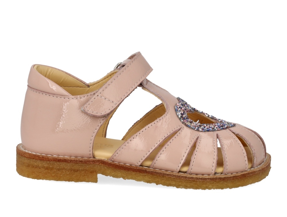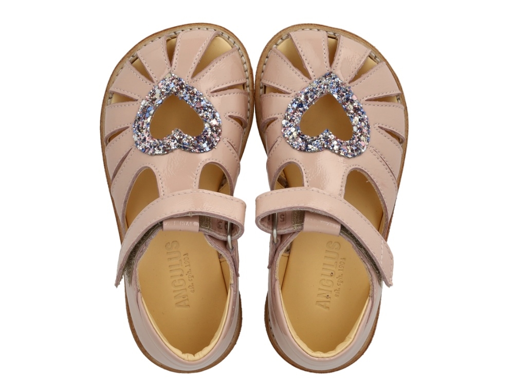 Sandal i rosa nuance fra Angulus med lukket tå, justerbar velcrorem og funklende glitterhjerte. Modellen er lavet i lakeret læder og har en fast hælkappe, polstret krave og fleksibel rågummisål, som giver god støtte omkring foden.