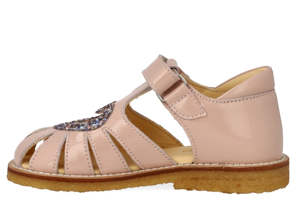 Sandal i rosa nuance fra Angulus med lukket tå, justerbar velcrorem og funklende glitterhjerte. Modellen er lavet i lakeret læder og har en fast hælkappe, polstret krave og fleksibel rågummisål, som giver god støtte omkring foden.
