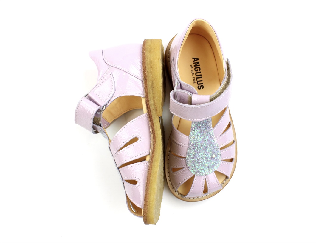 Lyselilla sandal fra Angulus med lak og mintfarvet glimmer.