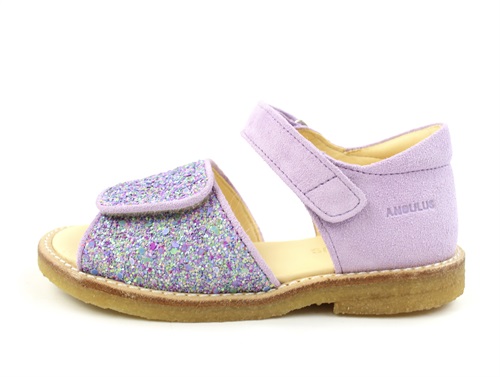 Lilla sandal med confetti glimmer fra Angulus. Sandalen har velcrolukning og justerbar velcro over vristen/tæerne.