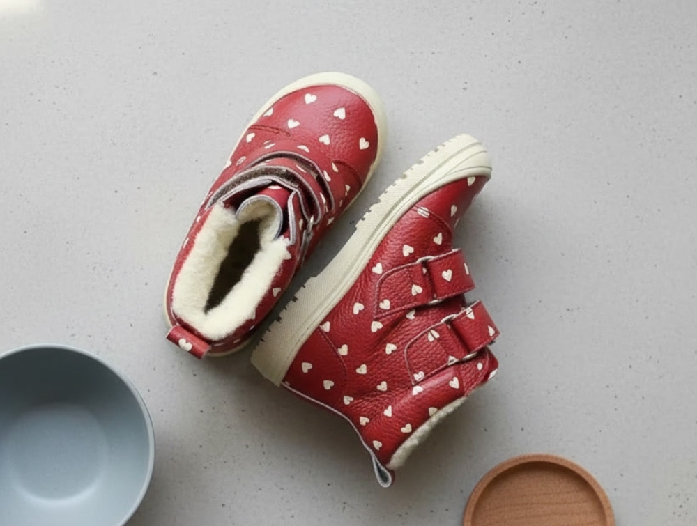 Angulus vinterstøvle i rød læder med hjerteprint. Støvlen har uldfor og tex og lukkes nemt med to velcroremme.