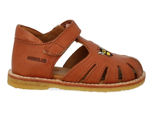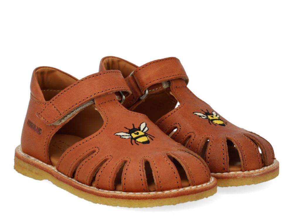 Angulus sandal i cognacfarvet læder med præget logo ved hælen. Sandalen har et sødt broderi af en bi på fronten.