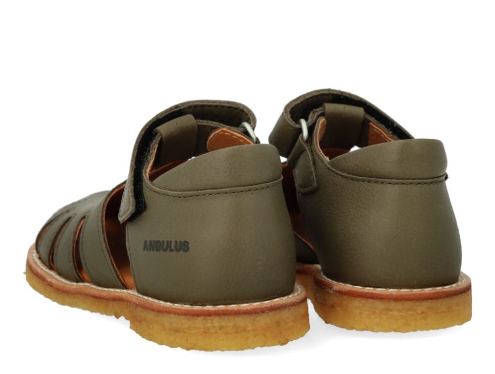 Angulus sandal i grøn (forrest) læder med præget logo ved hælen. Sandalen har et sødt broderi af en bi på fronten.