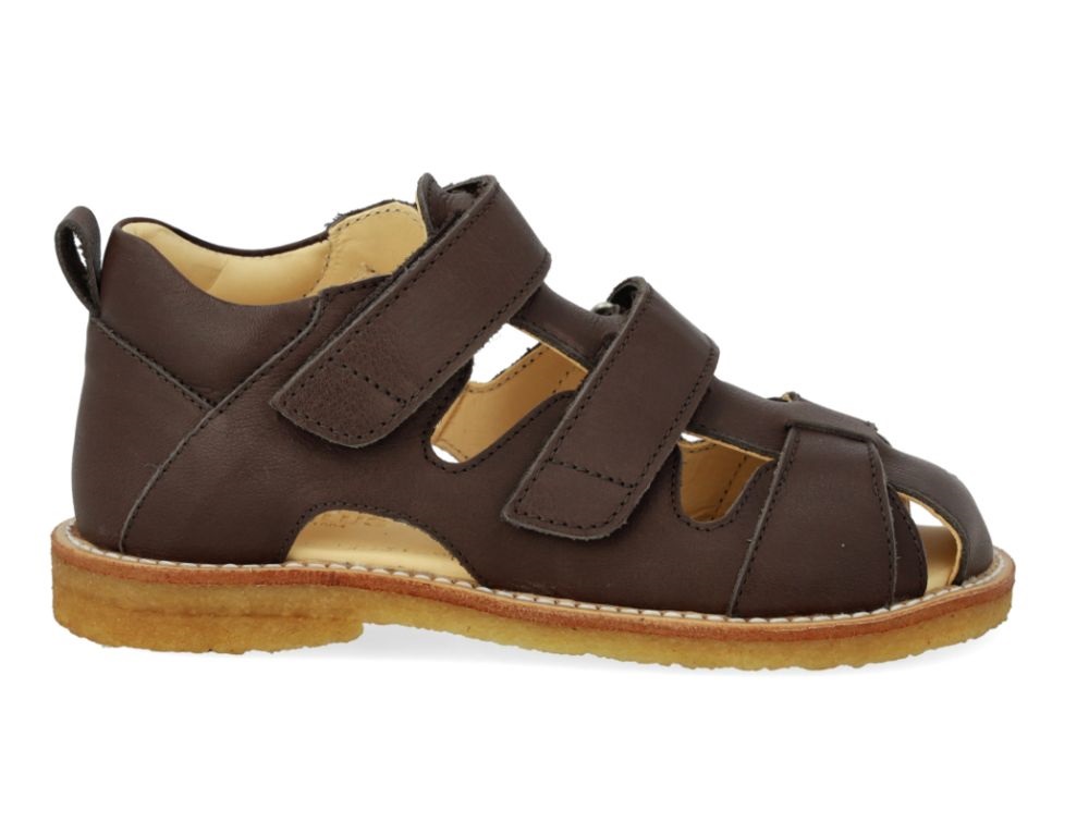 Klassisk lædersandal fra Angulus i mørkebrun med dobbelt velcrolukning og rågummisål.