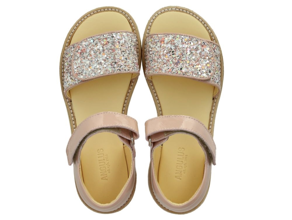 Angulus sandal i rosa (rosebud) med glimmer og lakfinish. Sandalen har en justerbar velcrorem og velcrolukning over vristen.