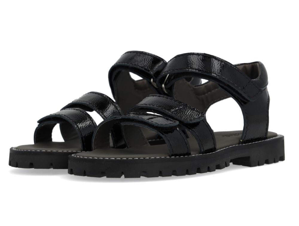 Sandal fra Angulus i sort læder med lakfinish, rund snude og sort tracksål.