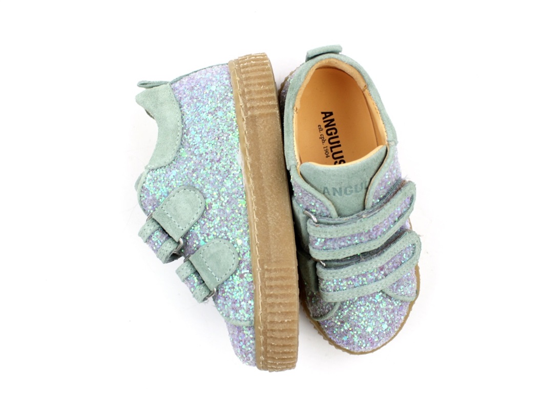 Sko med mintfarvet glimmer fra Angulus. Lukkes med to velcroremme.