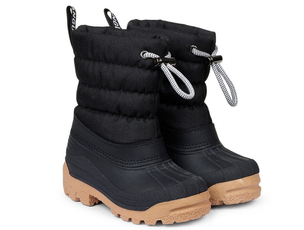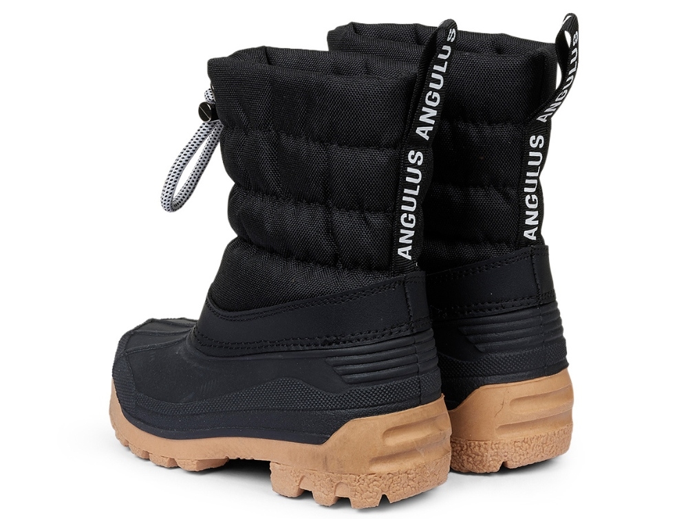 Sort snestøvle fra Angulus til børn. Nederste del er lavet i kraftigt gummi, der er 100% vandtæt, mens skaftet er i polyester. Støvlen er foret med en varm uldblanding, som gør den velegnet til kolde vinterdage.