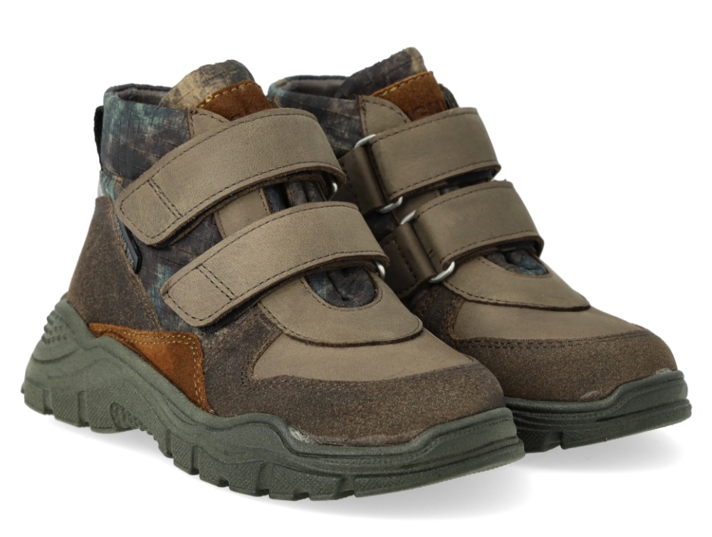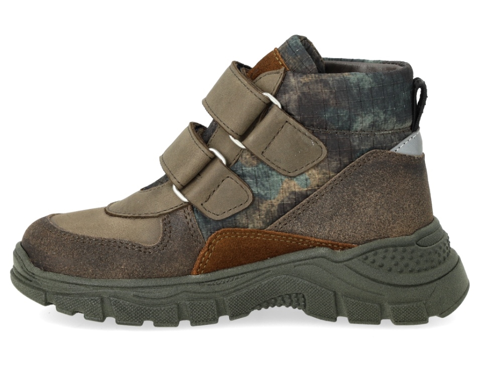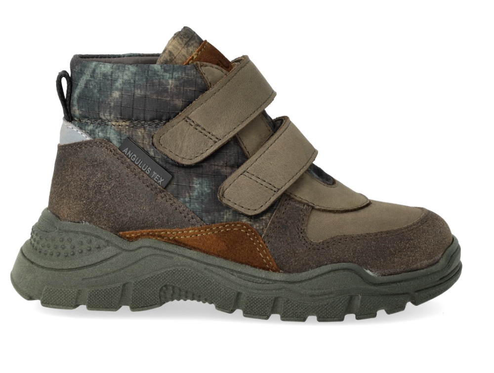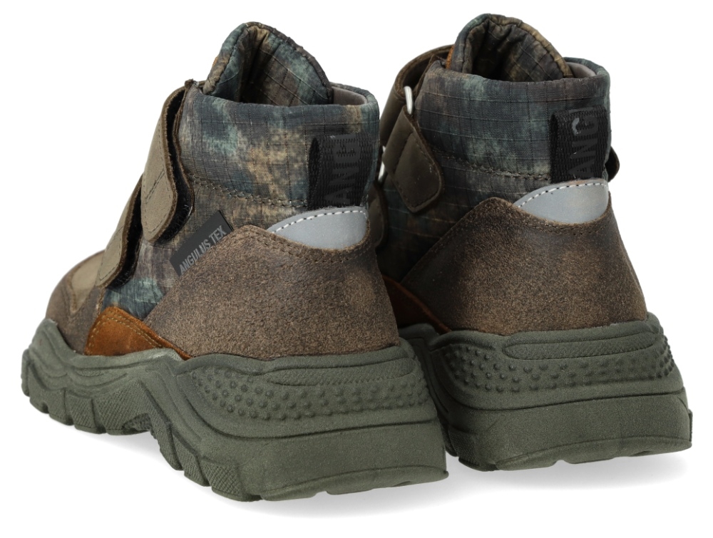 High-top TEX-sneaker i oliven og grønne nuancer fra Angulus med læderdetaljer og praktisk refleks bagpå. Modellen er fremstillet i genanvendt nylon kombineret med læder og er udstyret med to justerbare velcroremme. Hælstrop gør skoen nem at tage af og på.