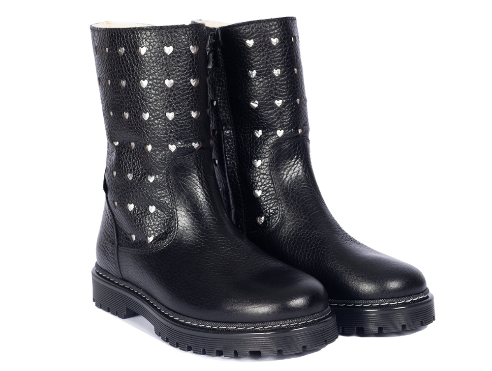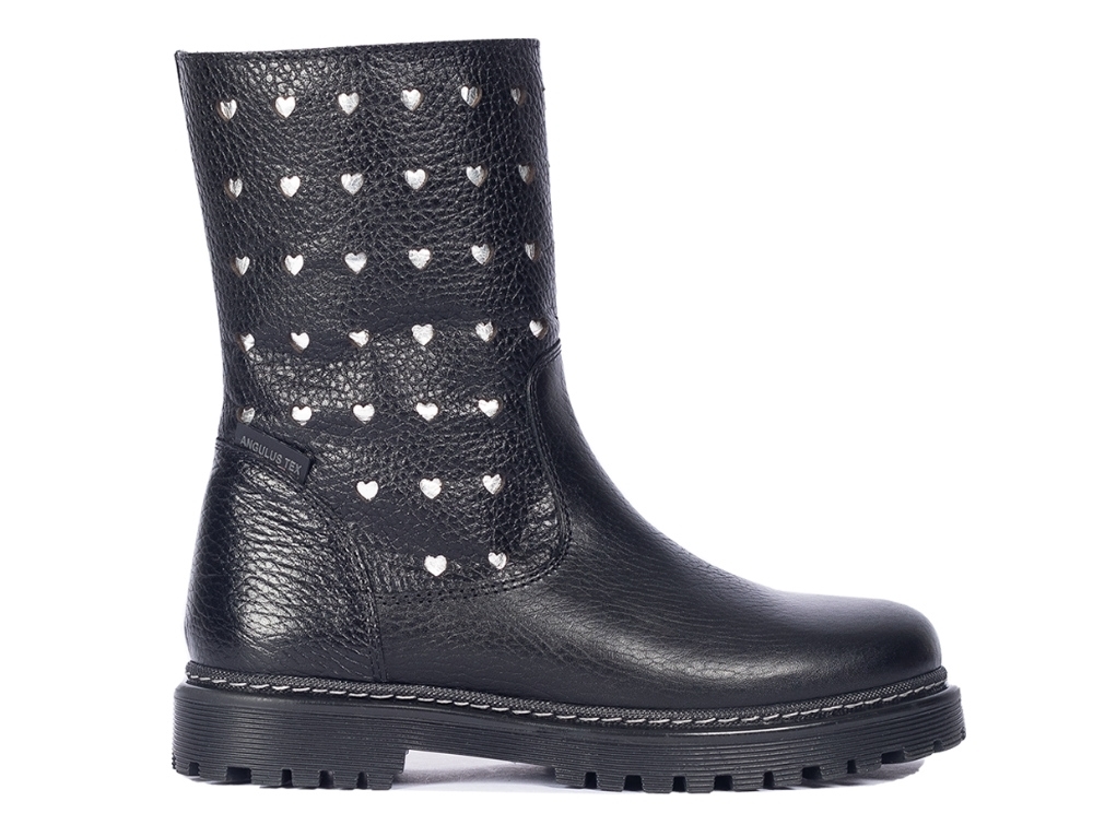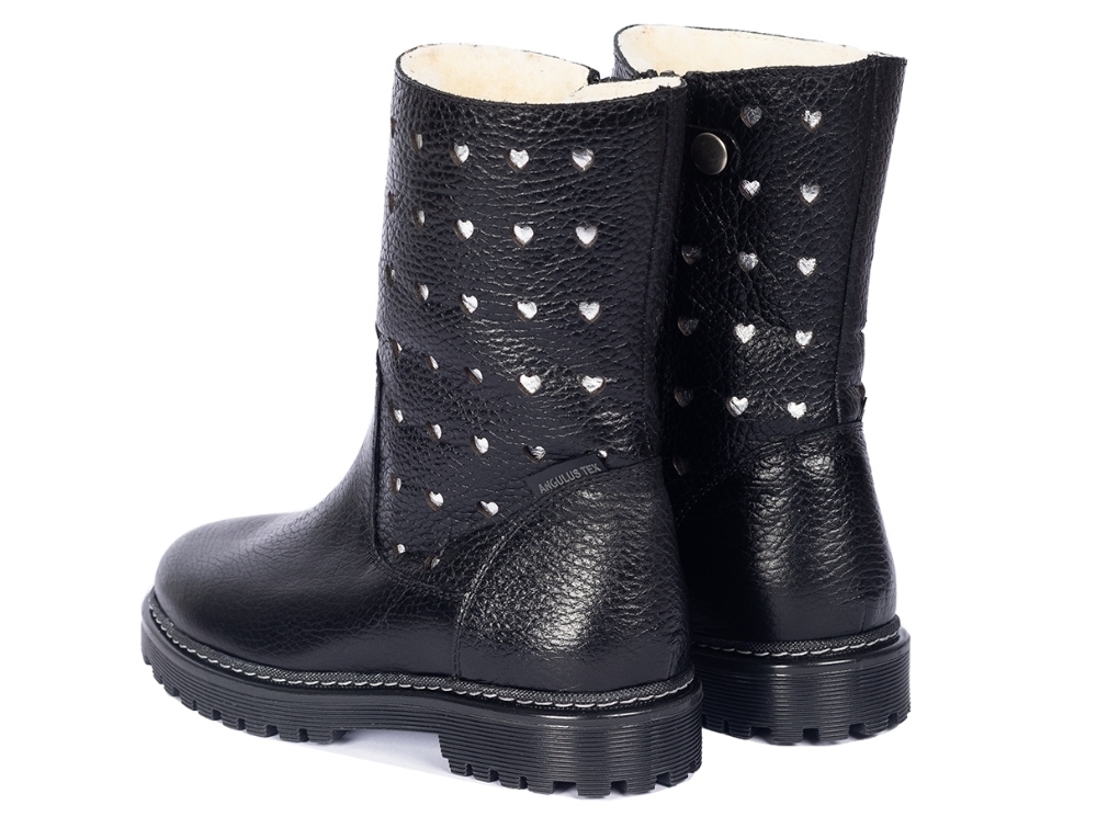 Angulus TEX-vinterstøvle i sort skind med dekorative sølvhjerter. Støvlen er designet med rund snude, mellemhøjt skaft med lynlåslukning og trykknap. Den er foret med blødt merino uld, mens den PFAS-fri TEX-membran hjælper med at holde fødderne tørre i sne og slud.