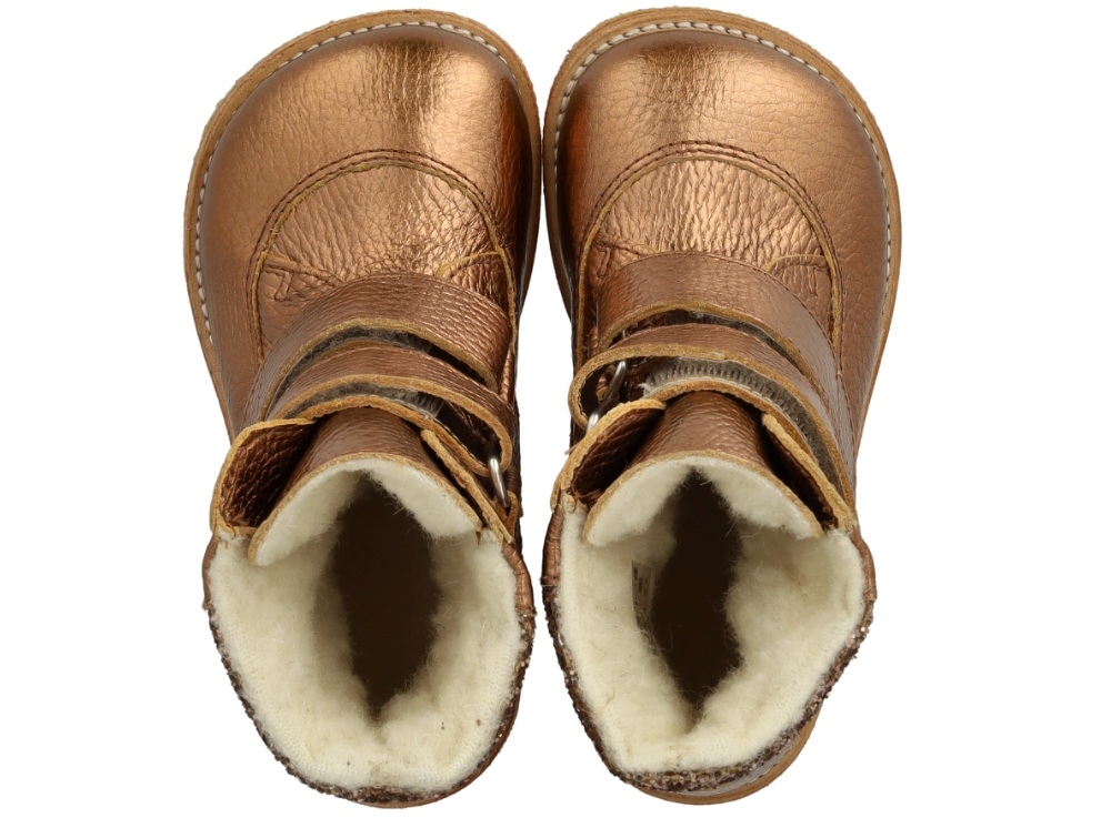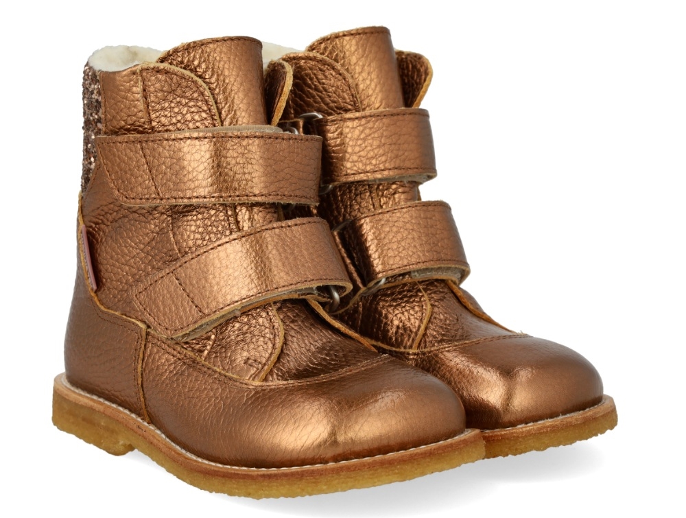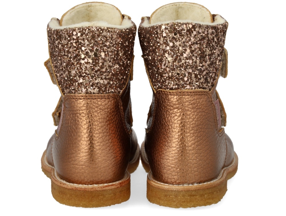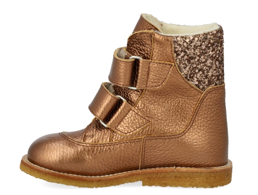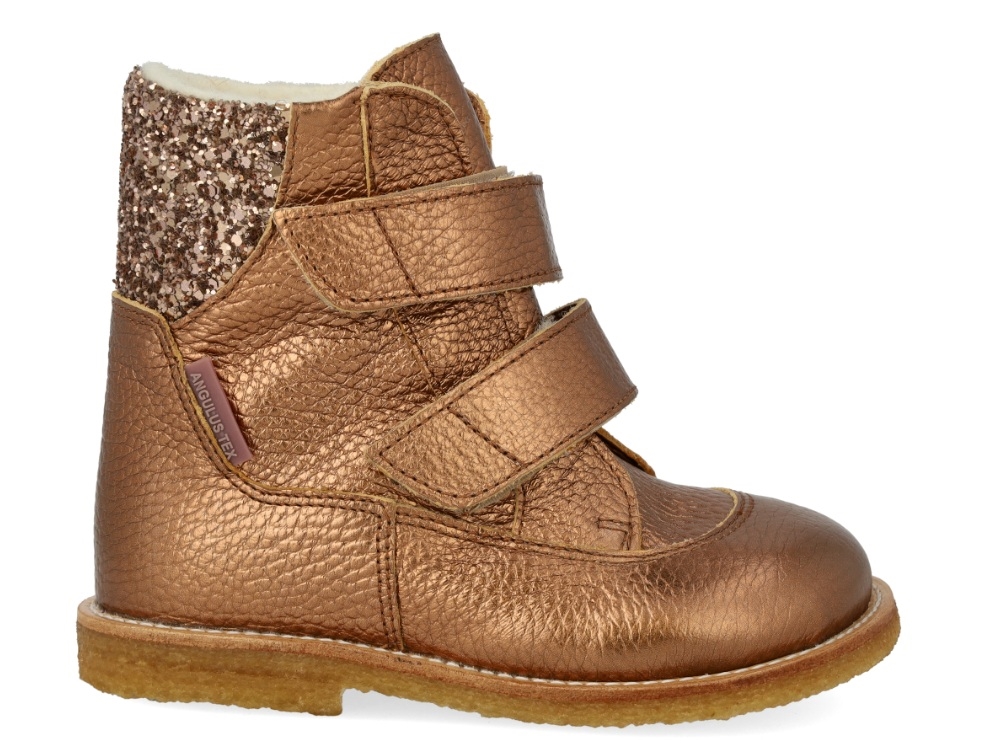 TEX-vinterstøvle i bronzefarvet skind fra Angulus med glitterdetalje øverst bagpå. Modellen er designet med rund snude, to brede velcroremme og en fast hælkappe med polstret krave for ekstra støtte og komfort. Støvlen er foret med blødt merinould, mens den PFAS-fri TEX-membran beskytter små fødder mod kulde, sne og slud i vinterhalvåret.