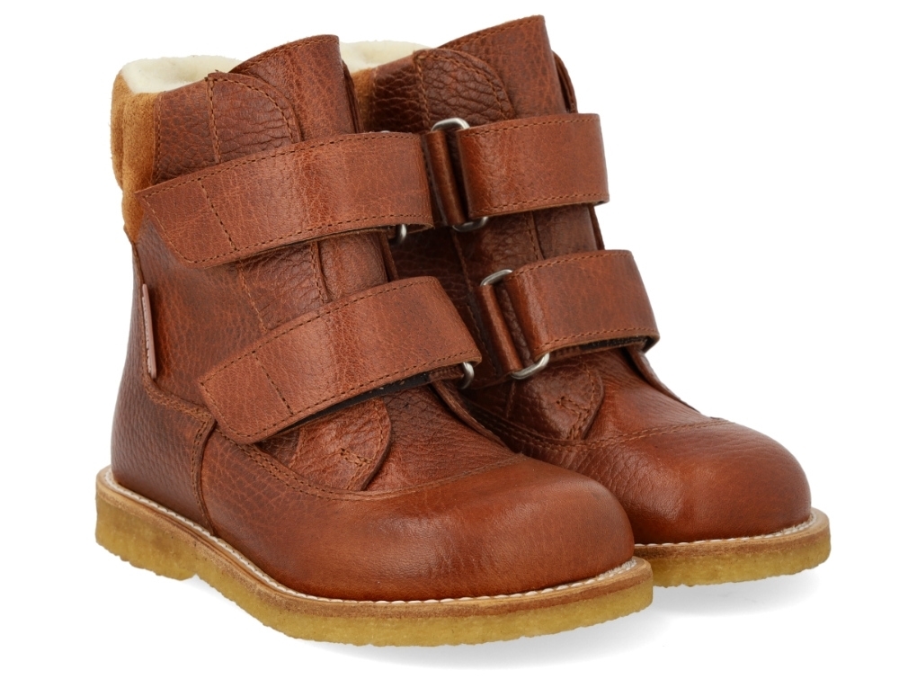 Klassisk TEX-vinterstøvle i cognacfarvet skind fra Angulus. En støvle elsket af mange kunder for sit tidløse design og høje kvalitet. Modellen er designet med rund snude, to brede velcroremme og en fast hælkappe med polstret krave i ruskind for ekstra støtte og komfort. Den er foret med blødt merinould, mens den PFAS-fri TEX-membran beskytter mod sne og slud.