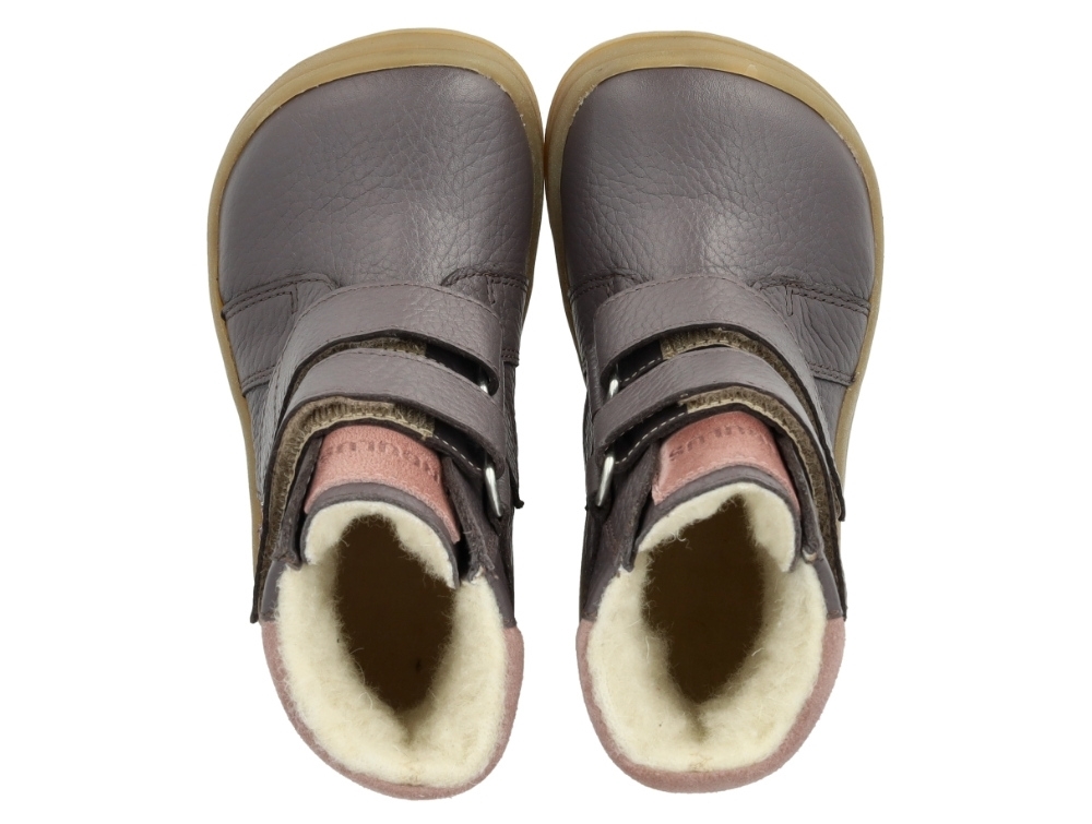 TEX-vinterstøvle i lavendelfarvet skind fra Angulus med en funklende glitterregnbue. Støvlen er designet med rund snude, to justerbare velcroremme og en fast hælkappe med polstret kontrastkrave for ekstra komfort og støtte. Den er foret med blødt merinould, mens den PFAS-fri TEX-membran beskytter mod sne og slud.