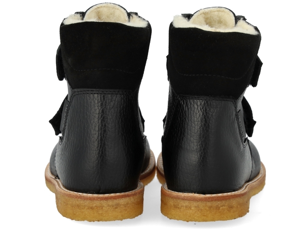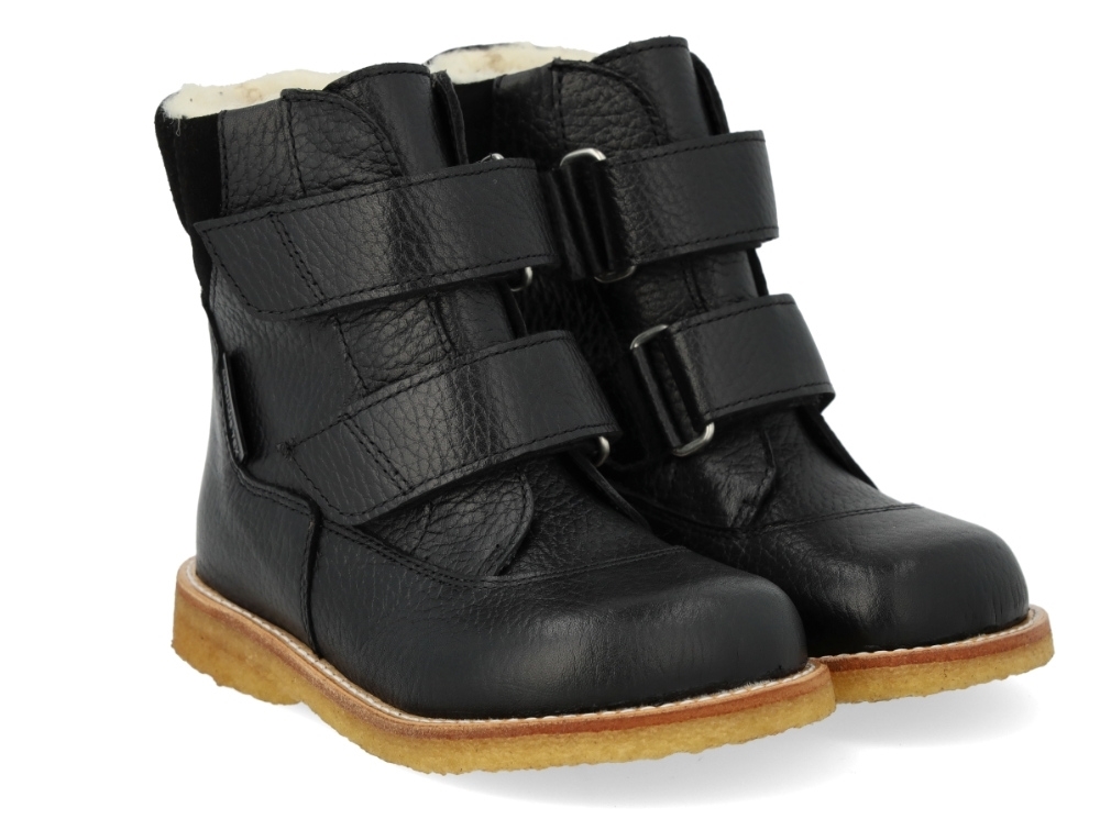Klassisk TEX-vinterstøvle i sort skind fra Angulus. En støvle elsket af mange kunder for sit tidløse design og høje kvalitet. Modellen er designet med rund snude, to brede velcroremme og en fast hælkappe med polstret krave i ruskind for ekstra støtte og komfort. Den er foret med blødt merinould, mens den PFAS-fri TEX-membran beskytter mod sne og slud.