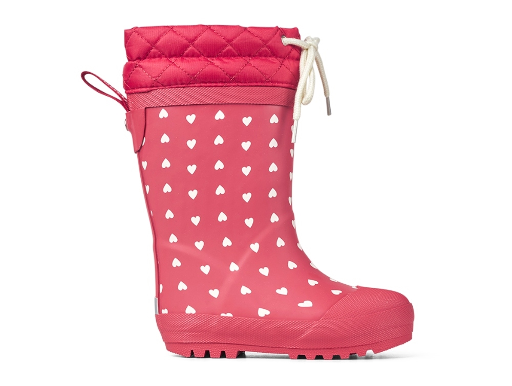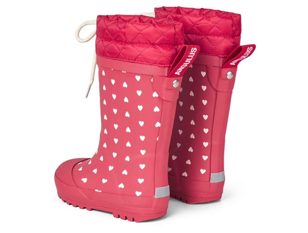 Rød vintergummistøvle i naturgummi fra Angulus med sødt hjerteprint. Modellen har quiltet overdel med snørelukning, logostrop bagtil og refleksdetalje på hælen. Indvendigt er støvlen foret med en blanding af uld og polyester, som gør den velegnet på kolde og våde vinterdage. Støvlerne er normale til lidt store i størrelsen.