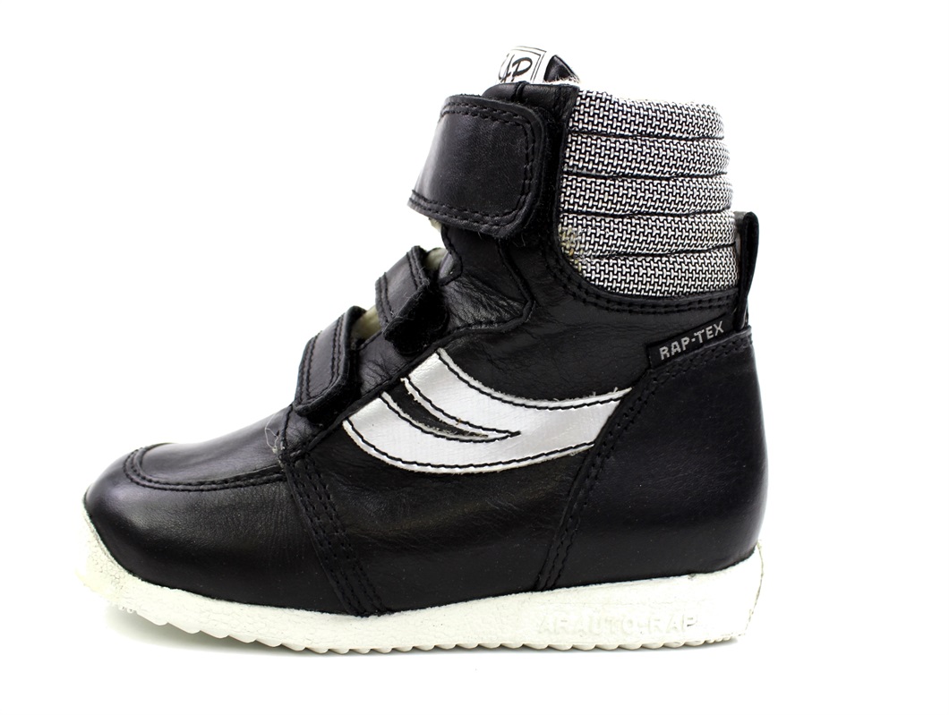 Sort vinterstøvle i læder med sølvfarvede striber fra Arauto RAP. Støvlerne har ægte uldfoer, hvid gummisål og TEX-membran.