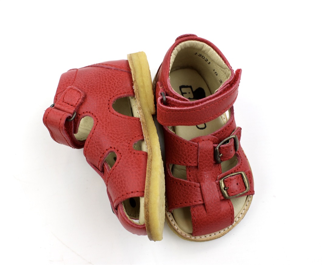 Røde lædersandaler fra Arauto RAP, som kan tilpasses rigtig fint til fødderne ved hjælp af spænderne over vristen/tæerne.