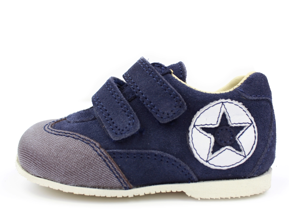 Navyfarvede brede ruskindssko med hvid stjernebadge og ekstra beskyttelse på snuderne fra Arauto RAP. Skoene lukkes med to velcroremme.