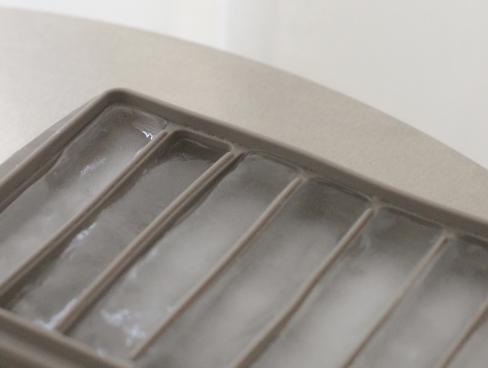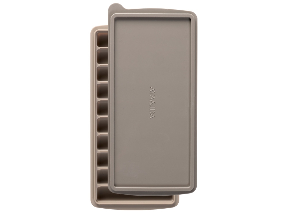 Isterningebakke i i flot brun nuance (driftwood) fra Aya&Ida. Formen giver aflange, smalle isterninger, der passer perfekt i Aya og Ida drikkeflasker.