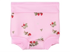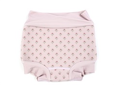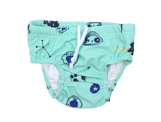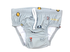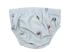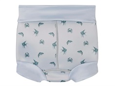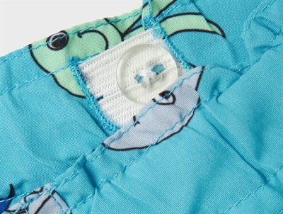 - Badebukser med plads til badeble – med bløde kanter, der ikke strammer og god komfort i både vand og på land. Supplér gerne med en UV-bluse med lange ærmer for at beskytte overkroppen effektivt mod solen. Har du ikke en UV-bluse, er en almindelig T-shirt det næstbedste valg – men husk, at baby stadig bør opholde sig mest muligt i skyggen, da små børn har meget følsom hud og ikke tåler direkte sol særlig godt.