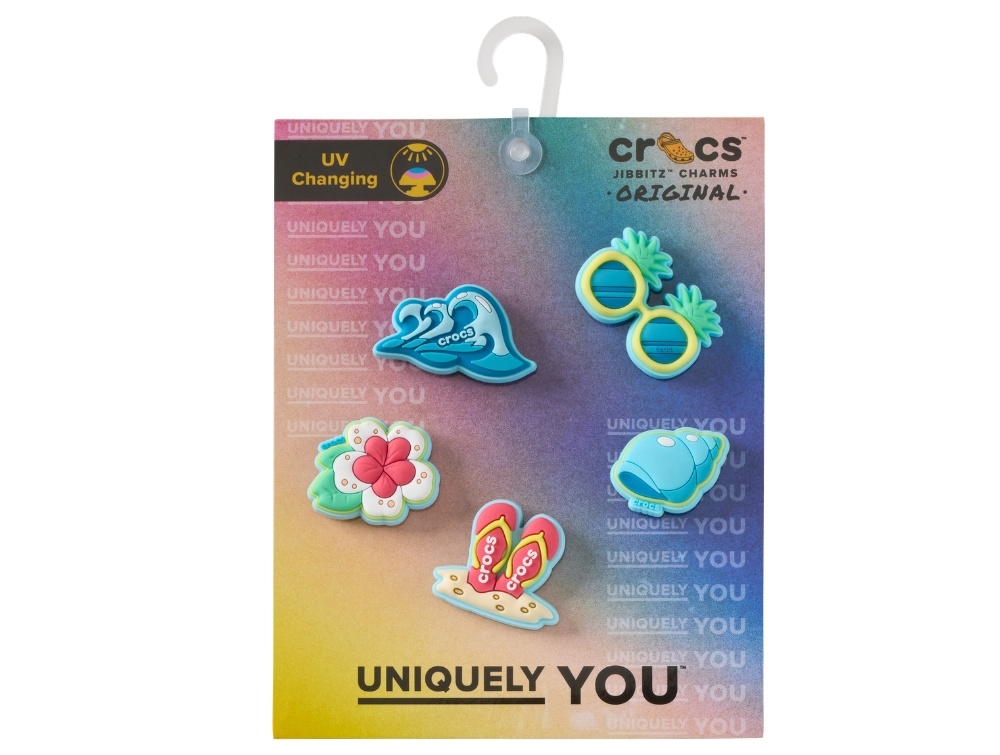 Charms i flere farver med sommermotiver som bølge, solbriller formet som ananas, musling, blomst og klipklapper i sandet. Pakken indeholder 5 forskellige charms, som passer til Crocs sandaler med huller. Charmsene er UV-reaktive og ændrer farve, når de udsættes for sollys.