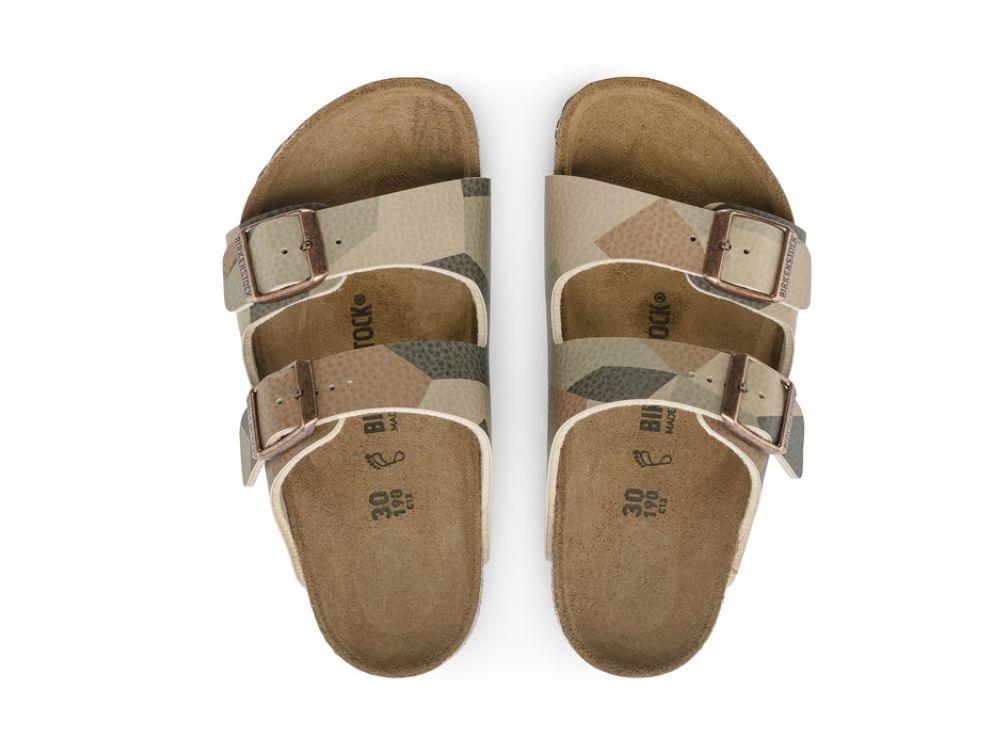 birkenstock sandal i desert soil geo camo med to spænder, set fra sidenbirkenstock arizona sandal i camouflagefarver med spænder, set skråt forfrabirkenstock børnesandal i desert soil geo camo med to justerbare spænder, set oppefra