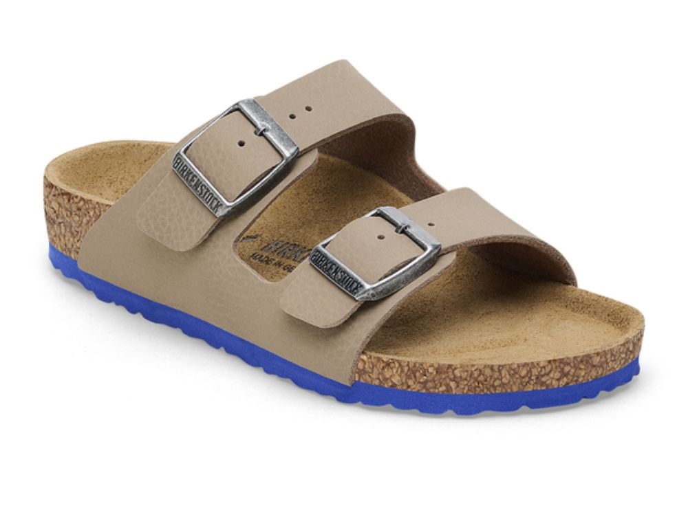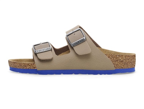 Arizona-sandal fra Birkenstock i farven taupe med to spænder, indvendig skindsål og korksål med blå EVA-gummi i bunden.