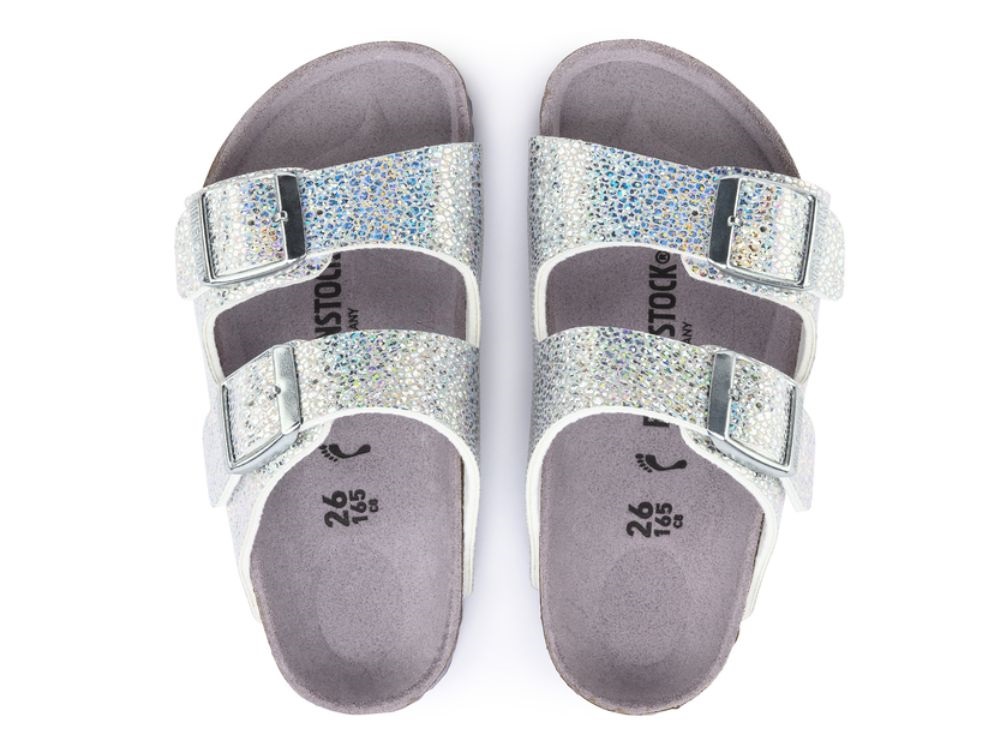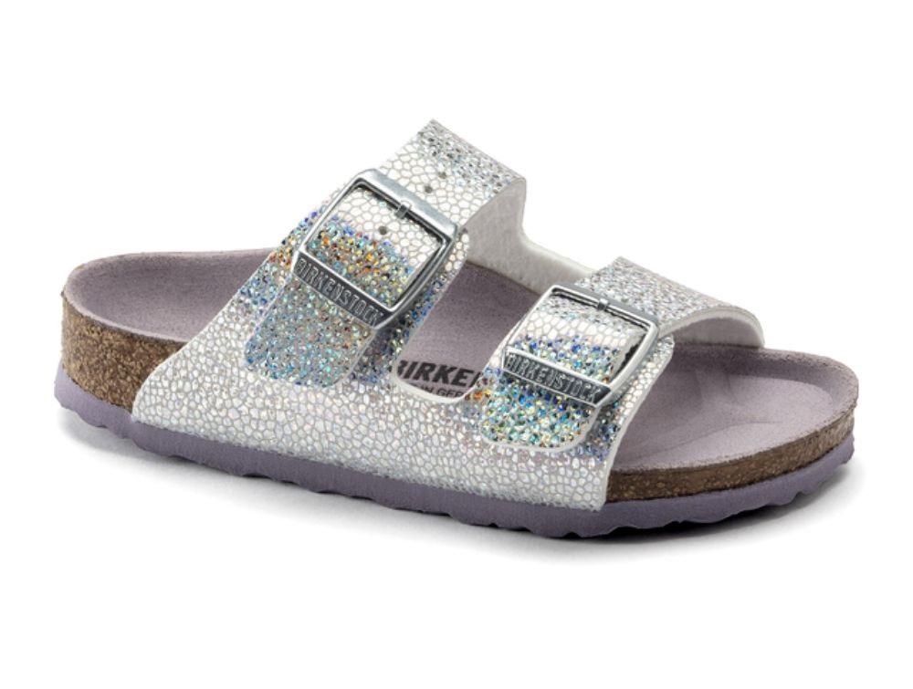 Sølvfarvet Arizona-sandal fra Birkenstock med to spænder, indvendig skindsål og korksål med lilla EVA-gummi i bunden.