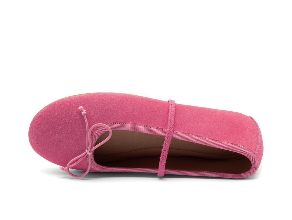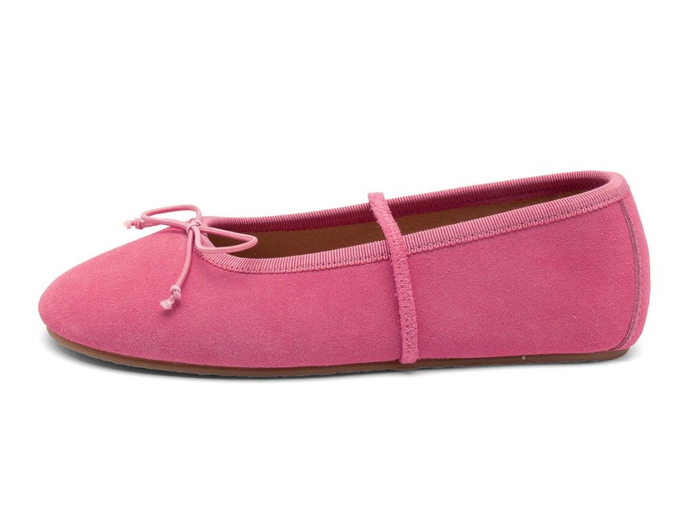 Ballerina i pink (candyfloss) ruskind fra Bisgaard med fin sløjfe foran og dekorativ elastik over vristen.