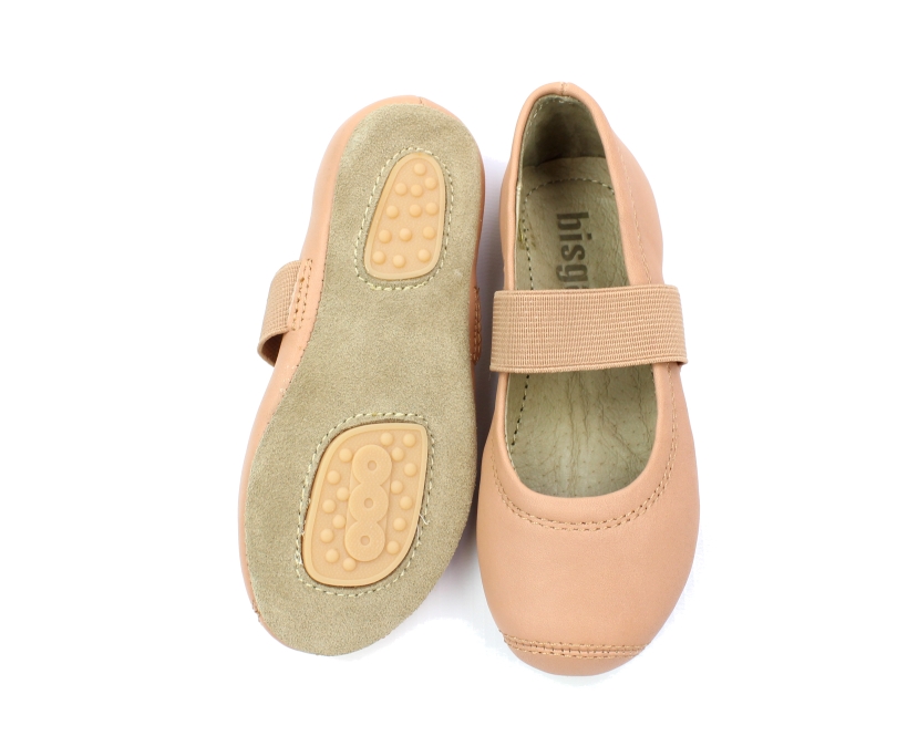 Nude-farvet ballerina med ballet-look fra Bisgaard. Ballerinaen sidder fast på fødderne ved hjælp af en elastikrem. Blød fleksibel skindsål med skridsikre gummifelter.