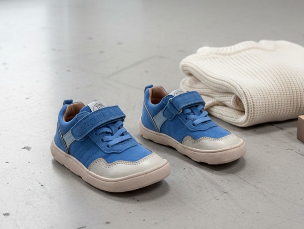 Sko i blå nuance fra Bisgaard – modellen Baloo er udviklet som en barfodssneaker i ruskind og læder. Den brede tåboks og flade sålkonstruktion giver foden frihed til at bevæge sig naturligt, mens den fleksible opbygning understøtter komfort i hverdagen.