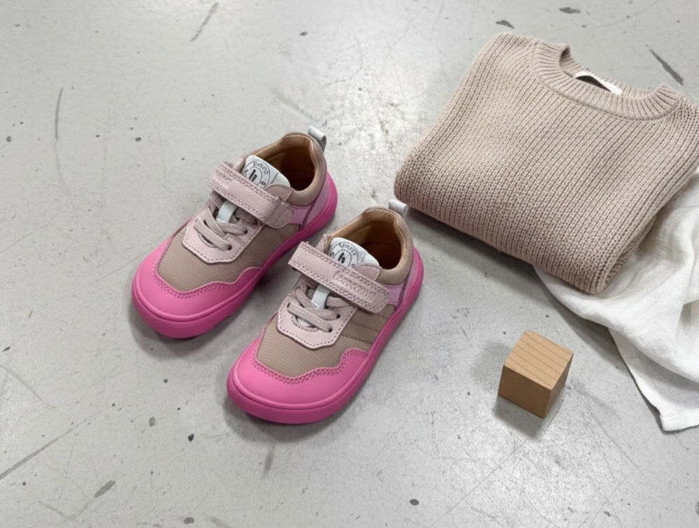 Skoen er konstrueret med flad sål uden hældrop (barfodssko design), hvilket fremmer en naturlig fodstilling og god balance. Den fleksible og skridsikre gummisål følger barnets bevægelser og giver et stabilt greb. Kombinationen af elastiksnøre og velcro gør modellen nem at justere og tage af og på.