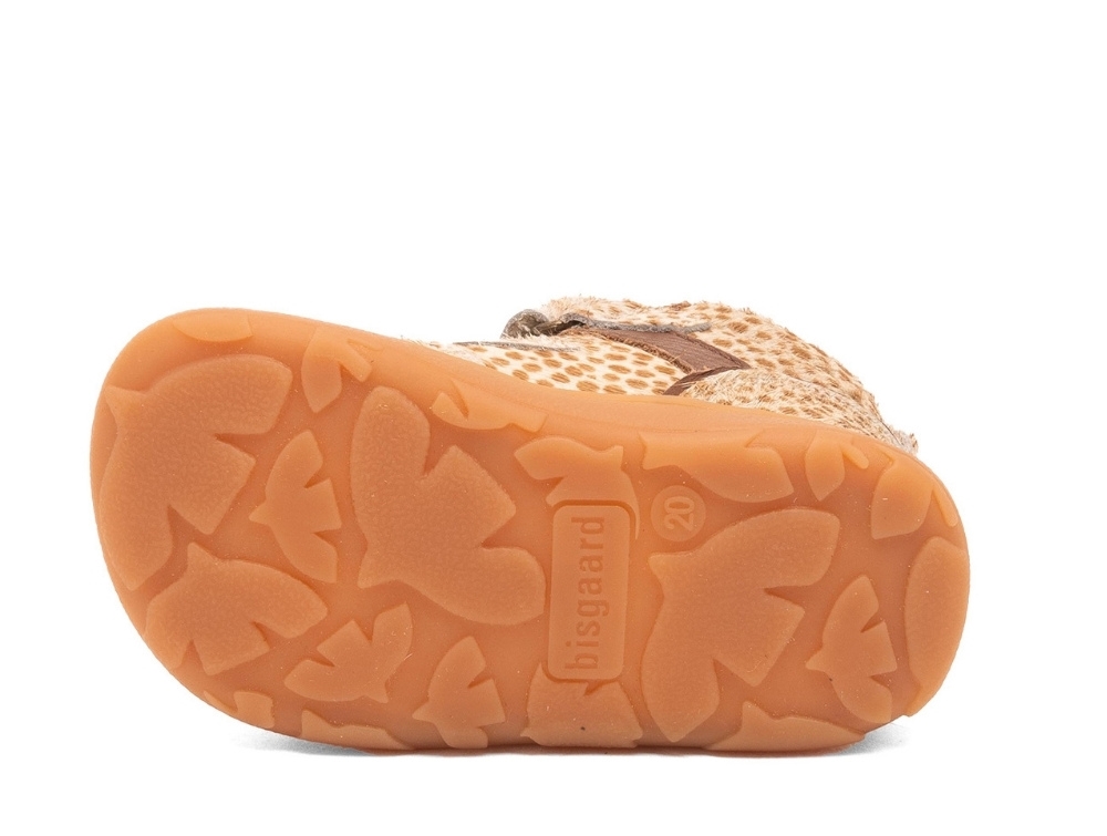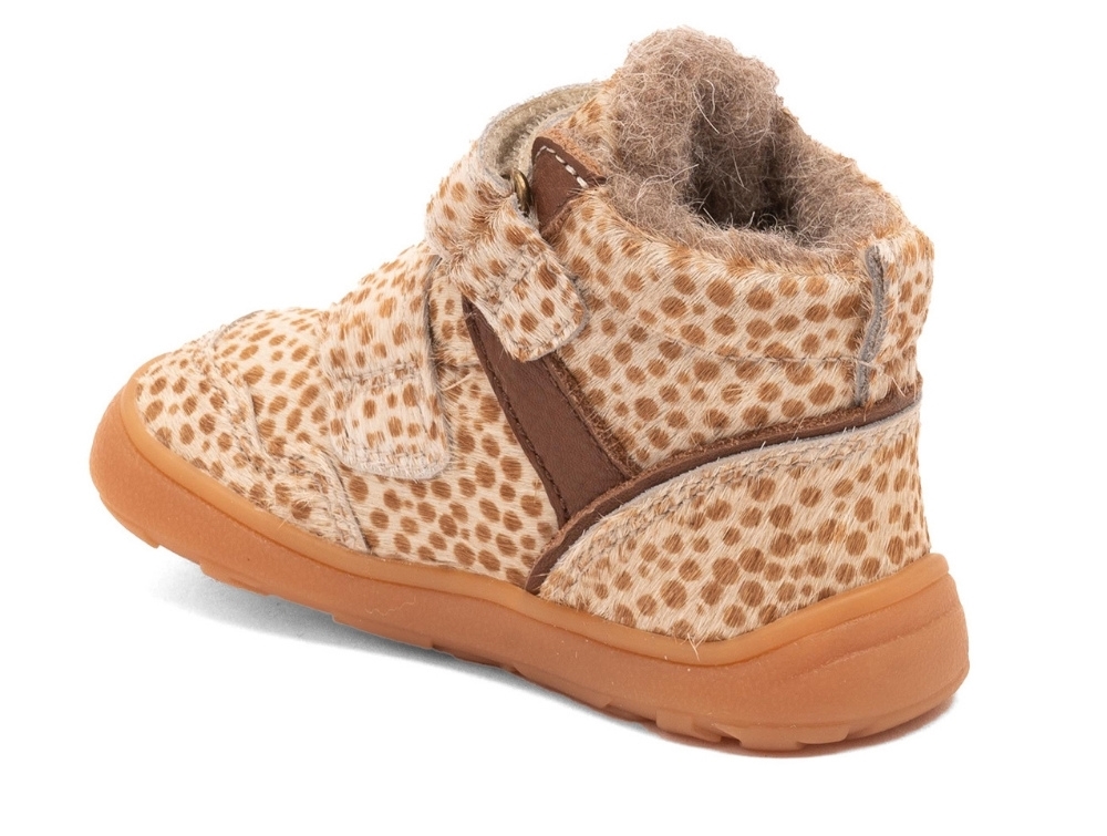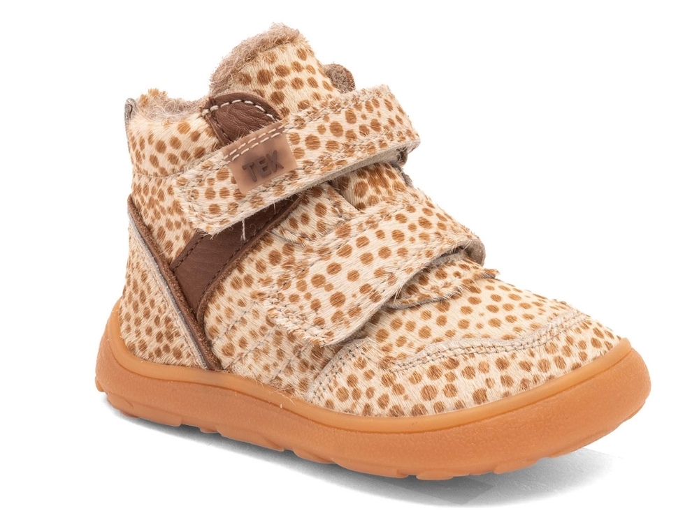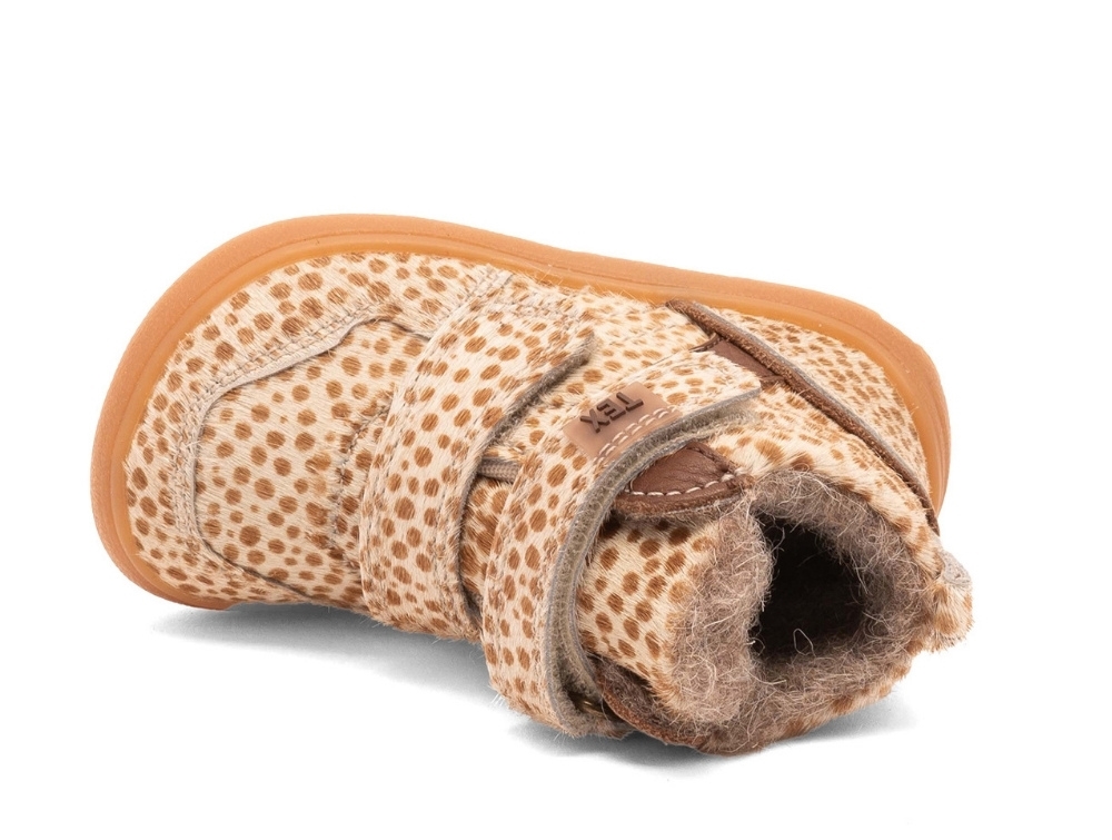 Vinterstøvle i brunprikket skind (brown dots) fra bisgaard. Becky TEX modellen er en barfodsstøvle med fokus på komfort og naturlig bevægelsesfrihed. Den er foret med blød uld, som holder fødderne varme i de kolde måneder, mens TEX-membranen beskytter mod regn og sne. De to velcroremme gør støvlen nem at justere og tage af og på.
