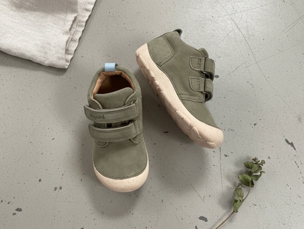 Begyndersko i varm grøn nuance fra Bisgaard – modellen Carter er udviklet som en startersko til børn, der øver sig på at gå eller lige har lært at gå. Den bløde ruskindsoverdel former sig naturligt om foden og giver støtte uden at begrænse bevægelsen.
