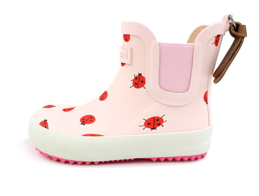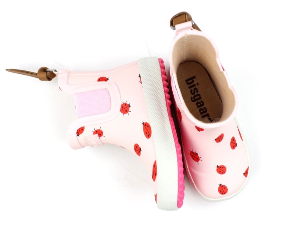 Søde gummistøvler fra Bisgaard i en fin rosa nuance med et sødt mariehøneprint. Støvlerne er lavet af naturgummi og har et kort skaft, der gør dem lettere for små børn at gå i sammenlignet med støvler med højt skaft.