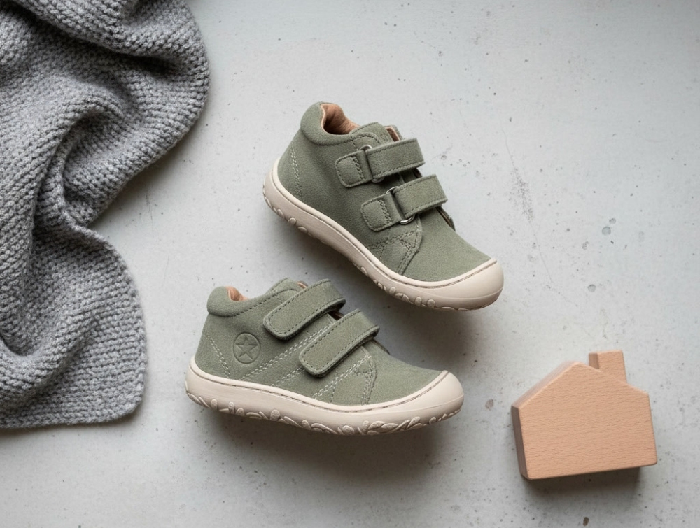 Sko fra Bisgaard i en støvet grøn nuance i ruskind. Skoene er lavet til børn i alderen ca. 1-3 år og er lette og fleksible, hvilket gør dem velegnede til børn, der er ved at tage deres første skridt. Modellen Hale V har en støttende opbygning og er nem at justere med velcrolukning.