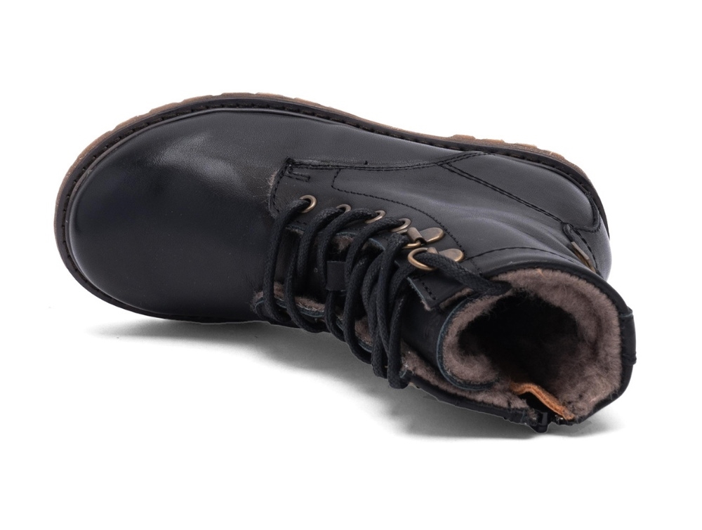 Sort vinterstøvle i læder fra Bisgaard med snørebånd og praktisk lynlås i siden. Støvlen er foret med blødt uld, som holder fødderne varme gennem vinteren. TEX-membranen gør modellen både vandafvisende og åndbar, så fødderne forbliver tørre og komfortable i skiftende vejr.