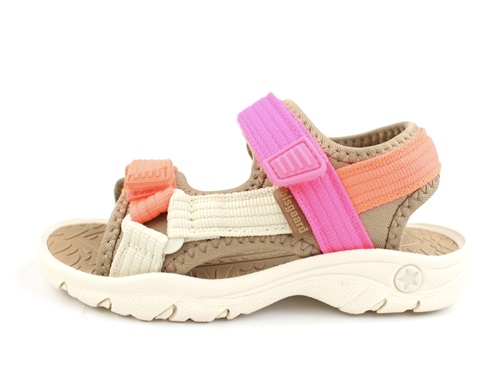 Let sporty sandal fra Bisgaard i neon pink, orange, råhvid og brun.