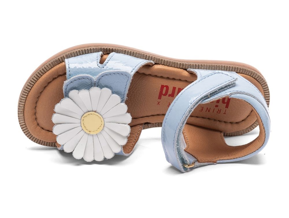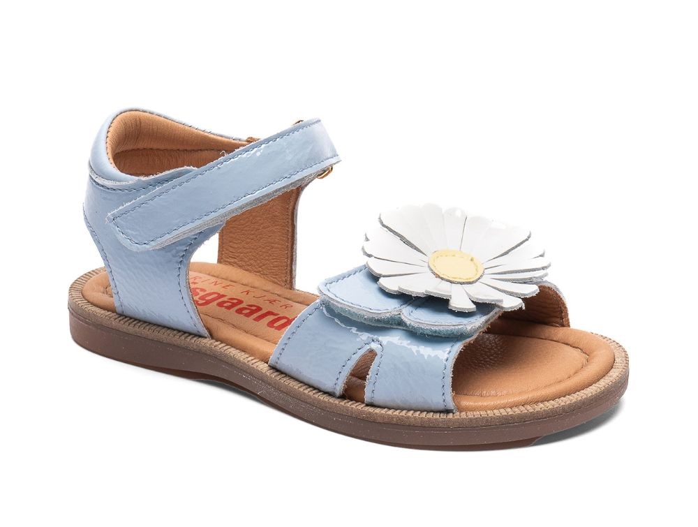 Fin sandal fra Bisgaard i lyseblå (sky blue) lak med margueritblomst – designet i samarbejde med Trine Kjær.