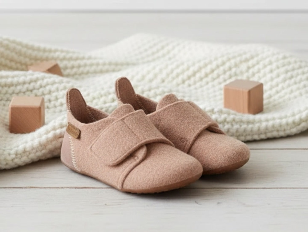 Hjemmeskoene har en blød fleksibel gummisål og ruskind ved hælkappen. Lukkes nemt med velcro.