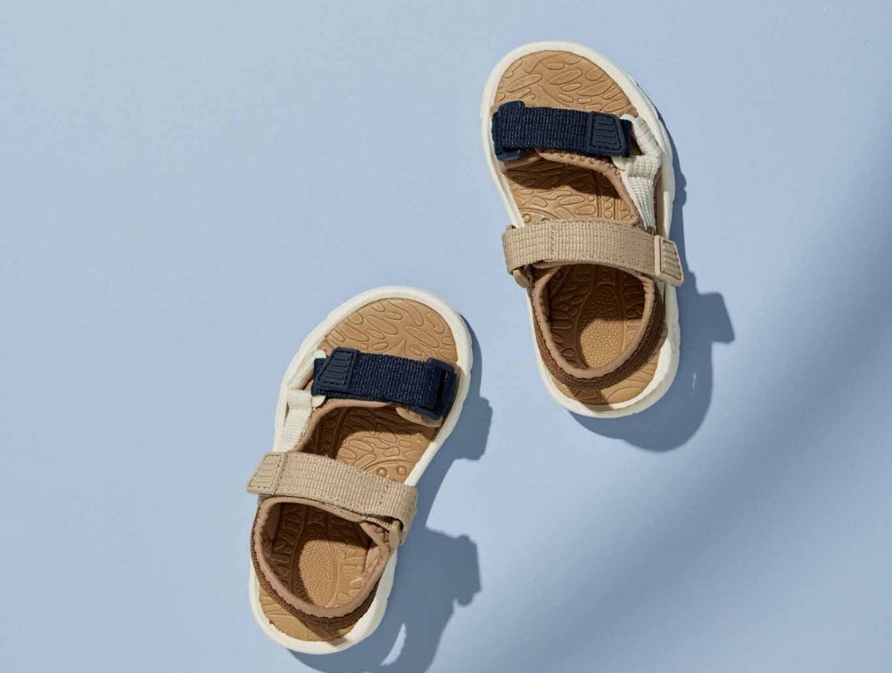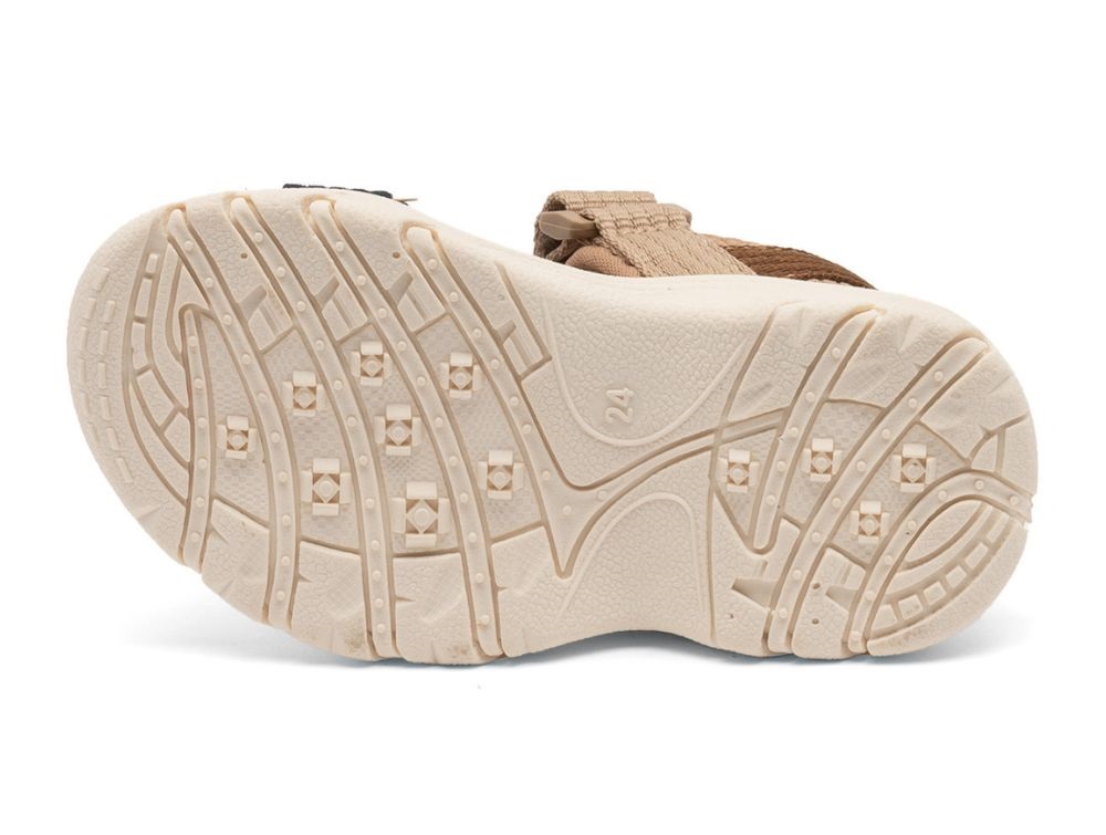Sandalen har en råhvid ydersål og lukkes med velcro ved anklen samt justerbar velcro over tæerne.