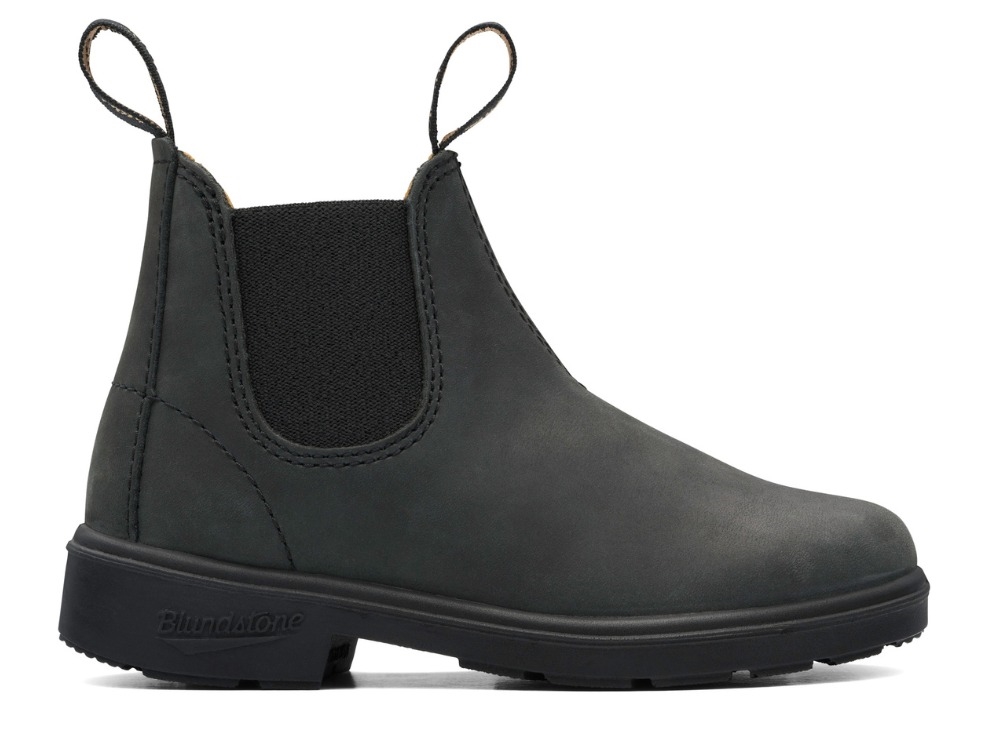 Blundstone Blunnies børnestøvle i sort rustik læder. En klassisk chelsea-støvle til børn med sort elastik i siderne og praktiske stropper, der gør den nem at tage af og på.