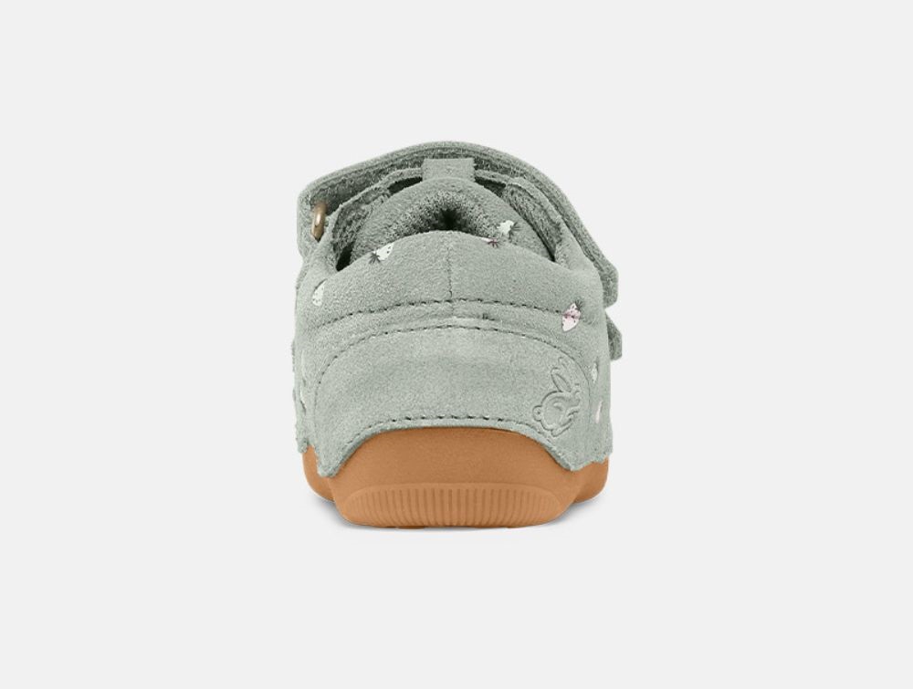 Lukningen består af to justerbare velcroremme, som gør skoen nem at tage af og på. Fronten har en slidstærk gummidetalje, der beskytter skoen – ideel til både kravlende og gående børn.