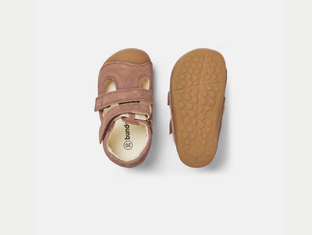 Sandal i brun nuance fra Bundgaard i modellen Petit Summer. En begyndersandal med lukket tå, der er designet til de første skridt med fokus på fleksibilitet, støtte og naturlig bevægelse.